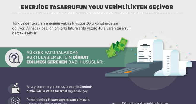 | Enerjide tasarrufun yolu verimlilikten geçiyor Türkiye’de tüketilen enerjinin yaklaşık yüzde 30’u konutlarda sarf ediliyor. Alınacak bazı önlemlerle faturalarda yüzde 40'a varan tasarruf gerçekleşebilir