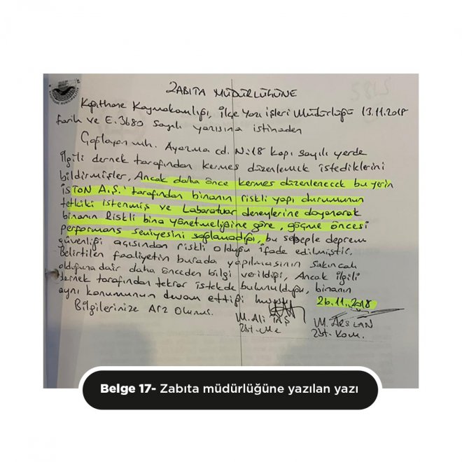 - Çürük raporları 02.2017 tarihinde uygun ve kesin şekilde alınıp, onların bu çürük raporuna itiraz etmesi sonucu, 17.07.2017 tarihinde Çevre ve Şehircilik İl Müdürlüğü vakfın itirazını oy birliğiyle red etmesi sonucu, Kağıthane Belediyesi riskli yapı olması nedeniyle, yıkmamasının cezai sorumluluğu Belediyede olacağından, 25.05.2017 tarihindeki yazıyla Belediye, riskli yapının 14.06.2017 tarihinde yıkılacağını ihtar edip, tahliye edilmesini talep ediyor. Yapmamanız halinde yasal işlem başlayacağı ithar ediliyor. (Ekte sunulacak)