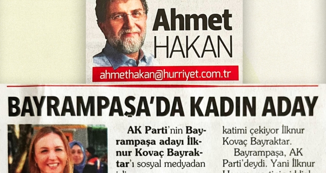 Ak Parti Bayrampaşa Belediye Başkan Adayı Av. İlknur Kovaç Bayraktar, kendisi hakkında "karınca gibi çalışıyor, hep sokaklarda, hep toplantılarda, hep ev gezmelerinde" diye bahseden ünlü gazeteci Ahmet Hakan'a sosyal medya aracılığıyla şu sözlerle teşekkür etti: