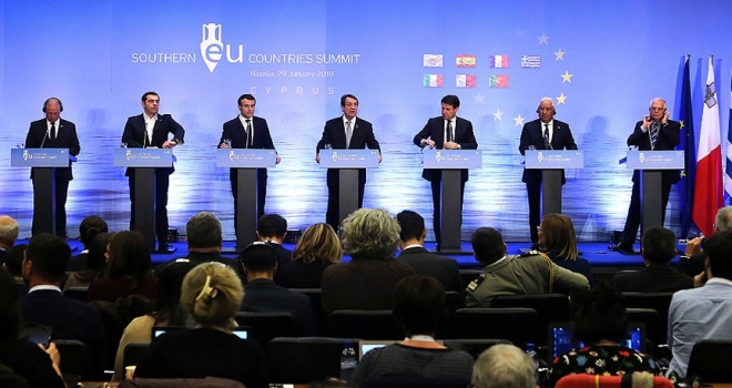 LEFKOŞA (AA) Güney Kıbrıs Rum Kesimi'nde düzenlenen 5. Avrupa Birliği (AB) Üyesi Güney Avrupa Ülkeleri Zirvesine, ev sahibi olarak Güney Kıbrıs Rum Yönetimi (GKRY) lideri Nikos Anastasiadis, İtalya Başbakanı Giuseppe Conte, Fransa Cumhurbaşkanı Emmanuel Macron, Portekiz Başbakanı Antonio Costa, Yunanistan Başbakanı Aleksis Çipras, Malta Başbakanı Joseph Muscat ve İspanya Dışişleri Bakanı Josep Borrell katıldı.