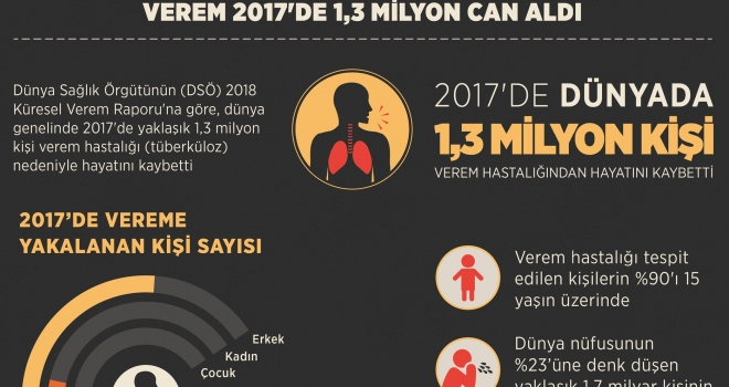 | Verem 2017'de 1,3 milyon can aldı Dünya Sağlık Örgütünün (DSÖ) 2018 Küresel Verem Raporu'na göre, dünya genelinde 2017'de yaklaşık 1,3 milyon kişi verem hastalığı (tüberküloz) nedeniyle hayatını kaybetti.
